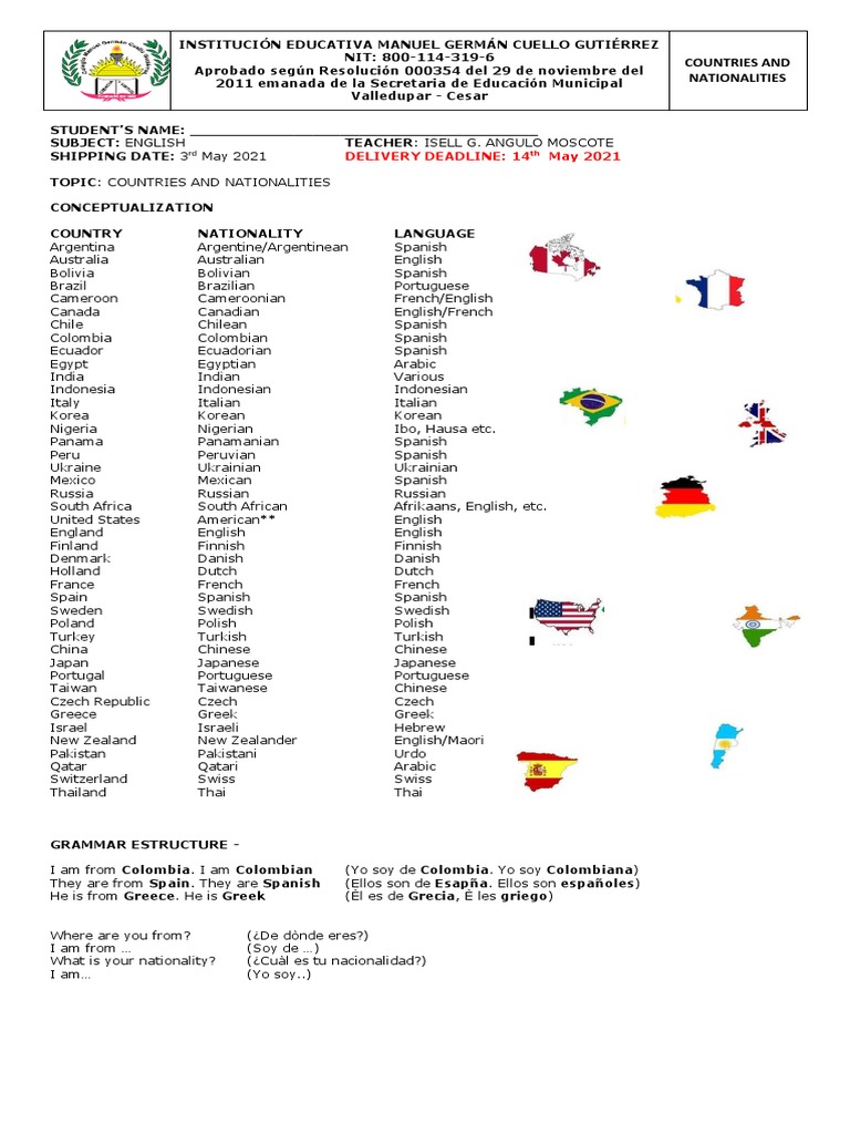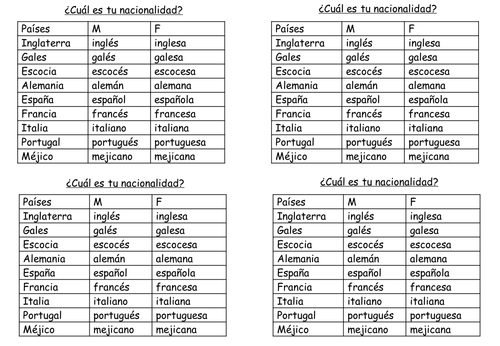 A veces es un poco lio saber cómo se dice la nacionalidad y es. En las tablas de abajo la columna País contiene los nombres de cada país como es comúnmente usado en inglés por ejemplo South KoreaLa columna Adjetivo contiene la palabra usada para describir algo de dicho paìs por ejemplo French cheeseLa columna Nacionalidad.