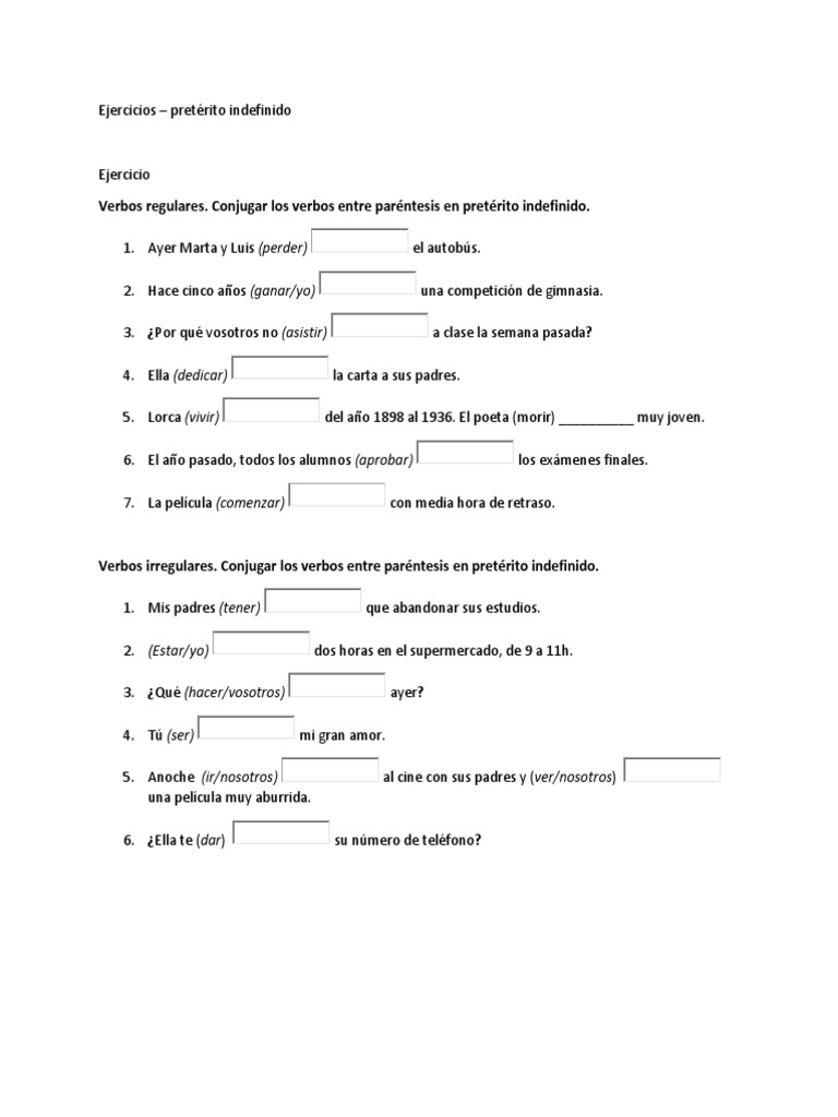 Ejercicios De Preterito Indefinido Regular En Espanol