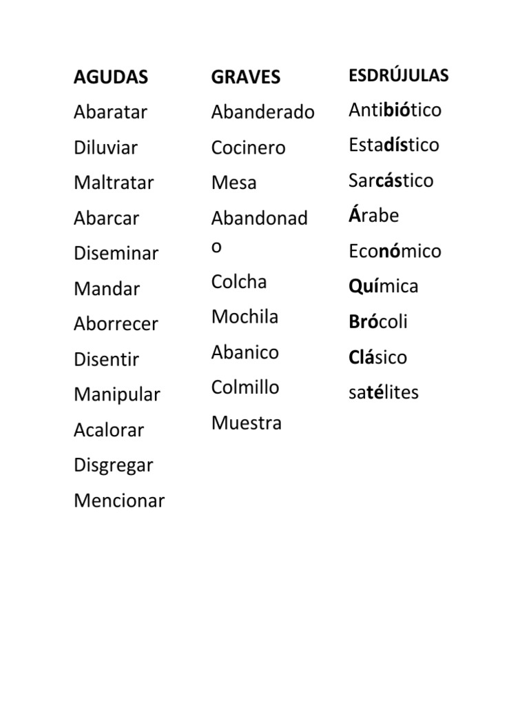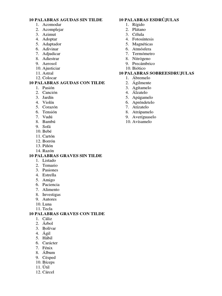 10 Palabras Sin Tilde Agudas Graves Esdrujulas Pdf