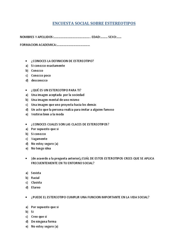 Encuesta Social Sobre Estereotipos Pdf Estereotipos Conceptos Psicologicos