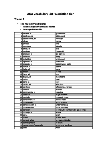 Spanish Aqa Vocab Lists By Themes Foundation And Higher Teaching Resources
