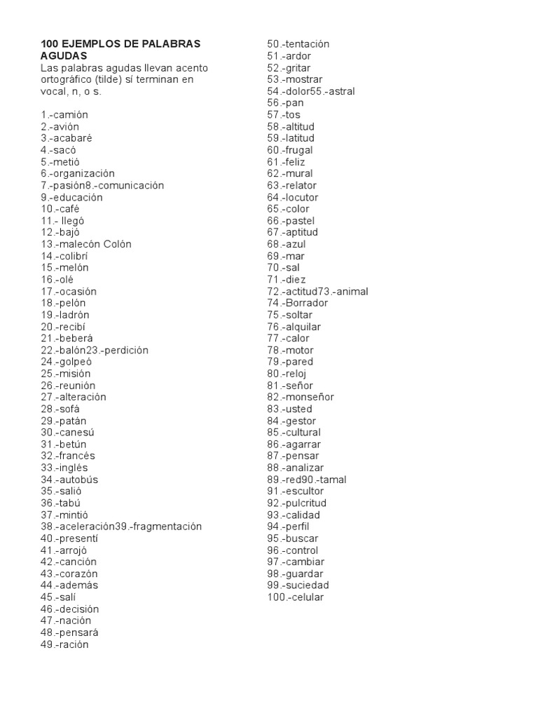 100 Ejemplos De Palabras Agudas Pdf Naturaleza