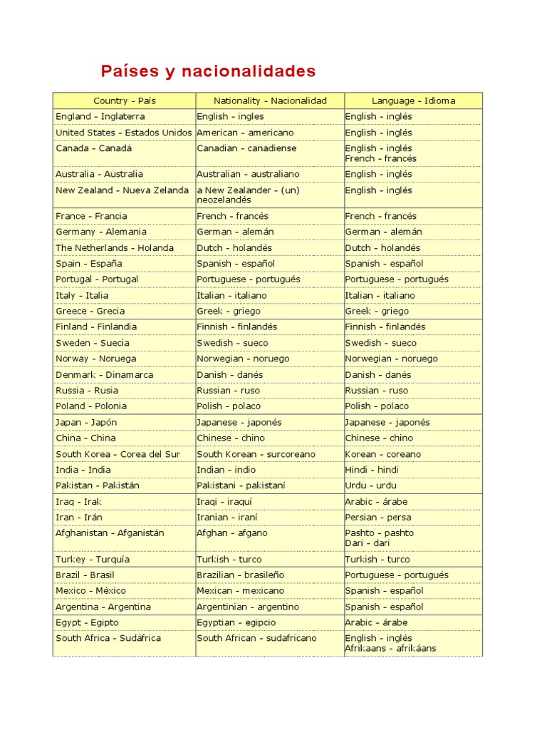 Nacionalidades Y Paises Conocelas En Ingles Y Espanol