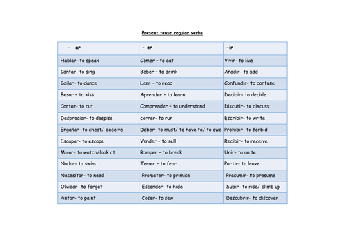 Spanish Verb Vocab List Infinitive Regular Ar Er Ir And Basic Irregulars