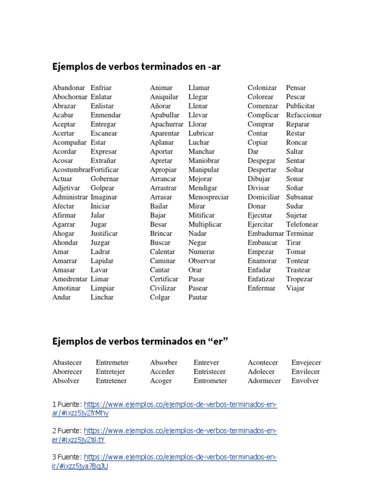 Verbos terminados en ar er ir ejemplos. Pasos para conjugar los verbos 1. Dentro de las oraciones los infinitivos no cumplen la función que verbo porque no están conjugados sino que funcionan. Asegúrate que el verbo esta en forma indefinida para saber así a que conjugación pertenece.
