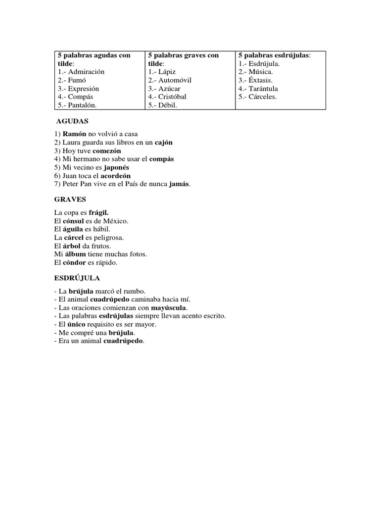 Ejemplos De Palabras Agudas Graves Y Esdrujulas Con Y Sin Tild Pdf