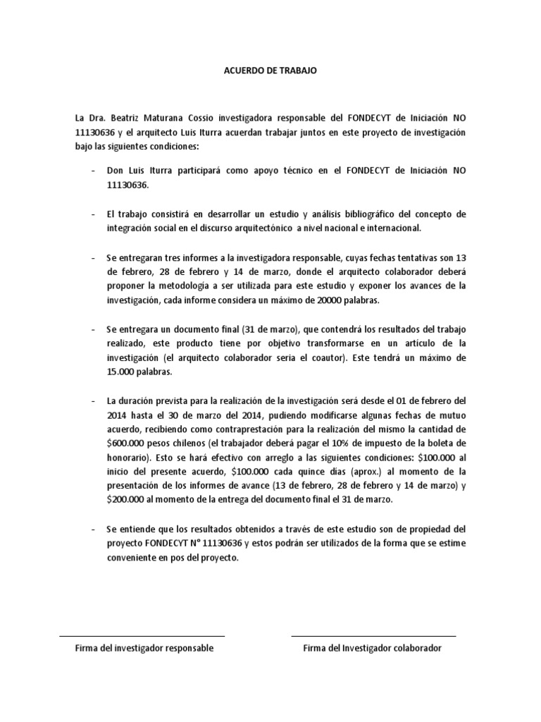 Acuerdo De Trabajo En El Proyecto De Investigacion Fondecyt De Iniciacion No 11130636 Arquitecto Negocios