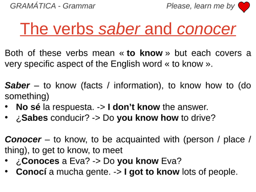 Saber And Conocer Grammar Work Teaching Resources