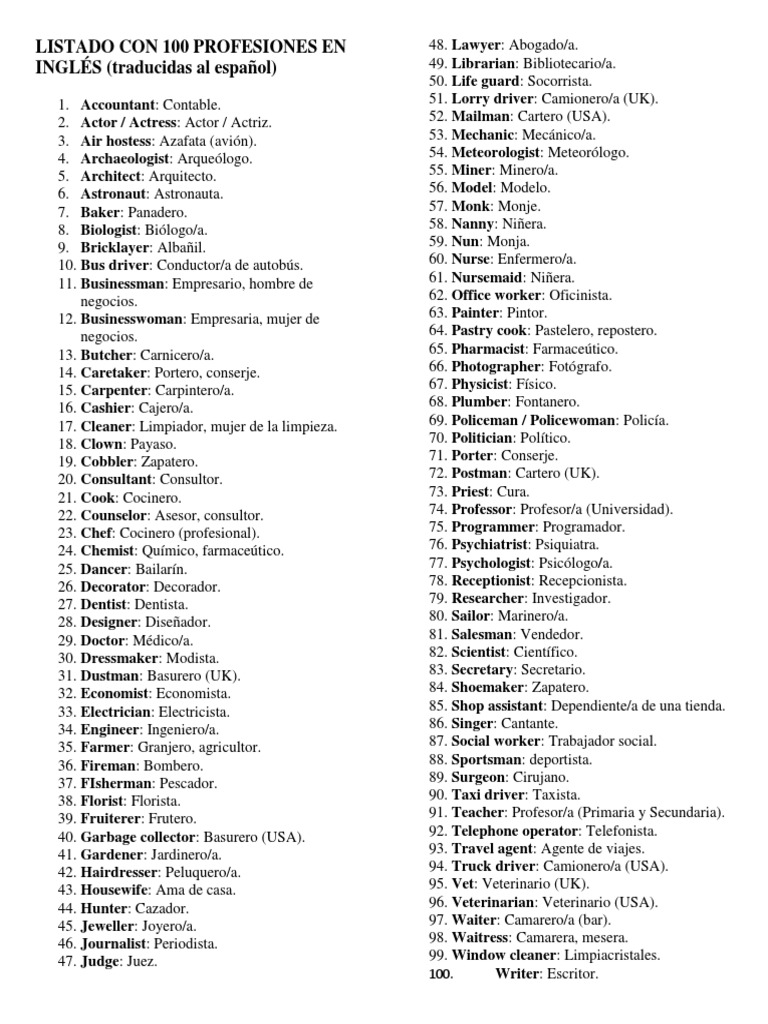 Listado Con 100 Profesiones En Ingles Pdf Empleo Science